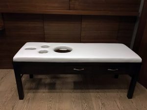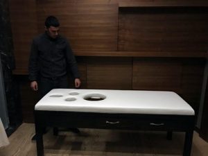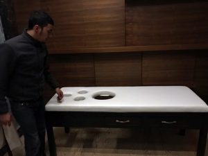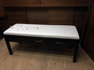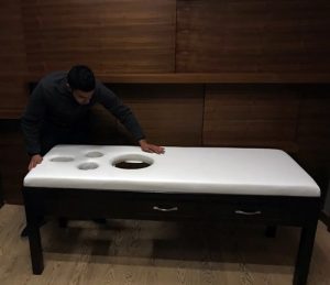 Çift çekmeceli tamamı ahşap malzemeden üretilen üst kısmı göbek ve göğüs bölgesine gelen kısımları delikli ve kapalı olan masa yüzüstü yatıldığında nefes alma deliklidir.