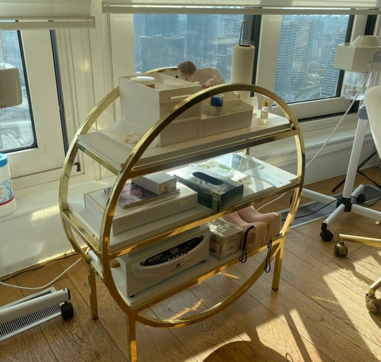 Tekerlekli Gold kaplama kozmetik malzeme rafı