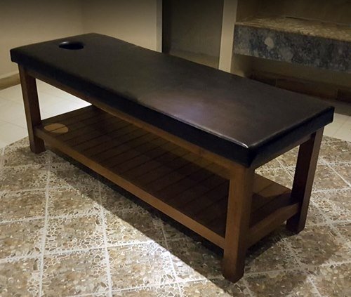 Baş kısmı delikli, alt kısmı havluluk bölümü, değişik ahşap renklerde masaj masası
