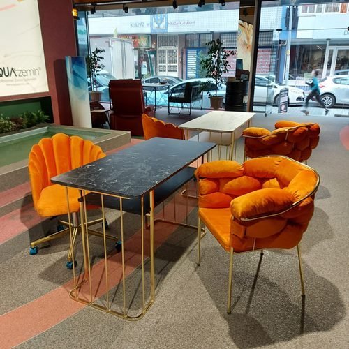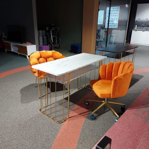 Protez Tırnak Masası gold renk metal aksam üzeri mermer desenli ahşap malzeme ve alt kısımda raf alanı olan dekoratif şık görünümlü manikür masası